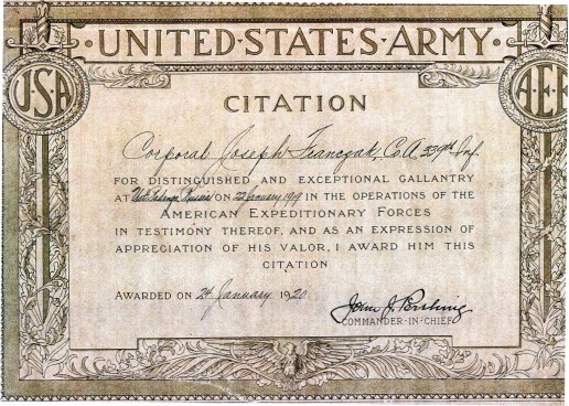 ![]() Cpl. Franczak's AEF Gallantry Citation, dated 24 January 1920. (Citation courtesy of Sue Franczak Lucas, granddaughter of Joseph Franczak) |