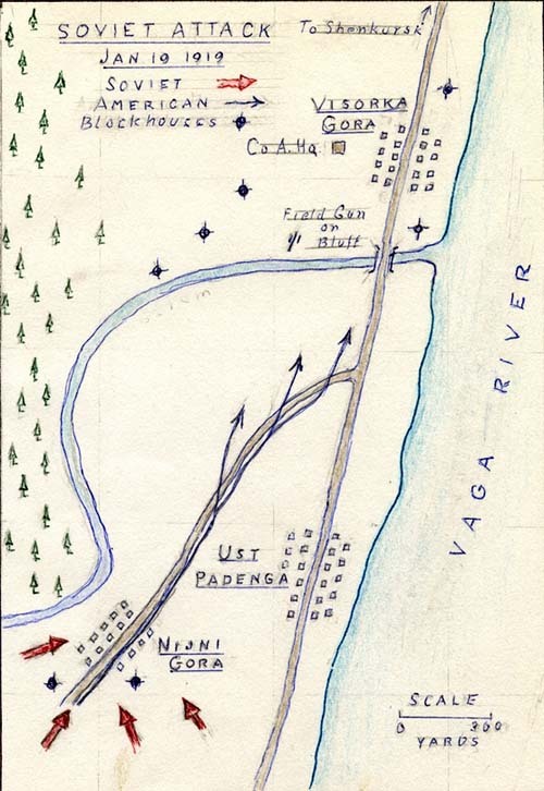 ![]() Map credit: Godfrey J. Anderson Papers, Folder number 1, Document number 1c.52, Bentley Historical Library, University of Michigan, Polar Bear Expedition Digital Collections [link to original full size image] [Link to Ust Padenga on Google Maps] Book credit: York, Dorothea.. The Romance of Company "A," 339th Infantry, A.N.R.E.F.. Detroit, Mich.: McIntyre Print. Co., c1923; Part IV, The Roll of Guns, pg. 84.[link to on-line book, subscription required]. |