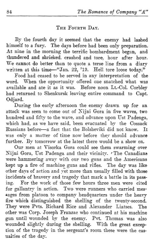 On January 19, 1919, Bolshevik Red Army troops attacked the 45 men of Company A's fourth platoon, who were holding the cluster of buildings on a hill known as Nijni Gora. At that time, this outpost was the deepest position in Russian territory held by any of the Allied forces in North Russia. The fighting continued over the next four days with great loss of life and many casualties as the men first retreated down the exposed hillside to nearby Ust Padenga and then fell back to Company A's headquarters in Visorka Gora. Here on Jan. 22, 1919, Allied troops tried to stop the Bolshevik advance and prevent them from taking nearby Shenkursk, a large city garrisoned by the Allied forces. Cpl. Franzac's role in the defense of Visorka Gora was mentioned in the book, The Romance of Company "A" :