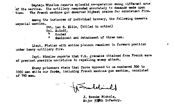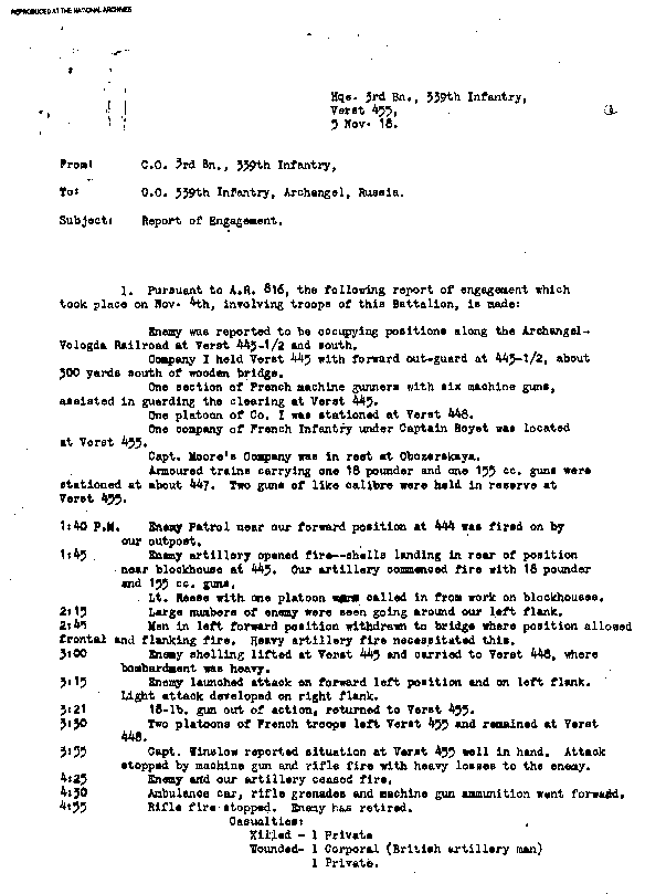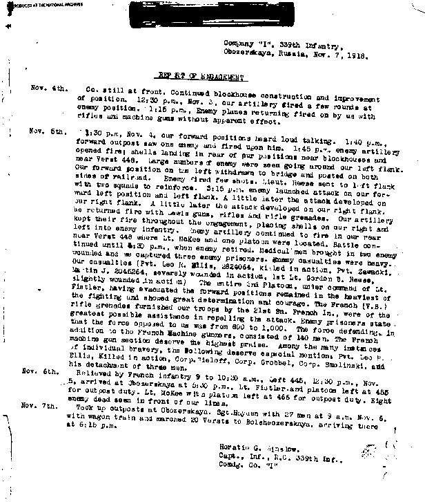 Below is the report submitted to HQ in Archangel by Major J. Brooks Nichols that describes the 04 NOV 1918 attack in somewhat greater detail, but it was obviously based on Capt. Winslow's report.